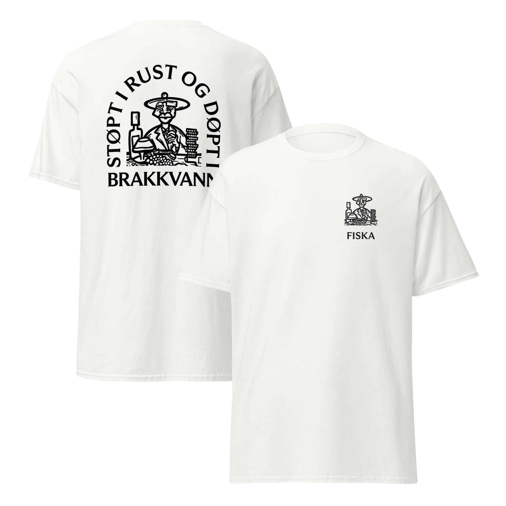 Albumkarakteren er tegnet av Lavrans Borgen. "Støpt i rust og døpt i Brakkvann" på ryggen. 190 g kvalitetsskjorte fra Black Dimond Clothing Company. Silketrykket i en svett kjeller på Strømsø i Drammen. Størrelsene øøørlite små, sier noen. Så er du i tvil - gå opp.
